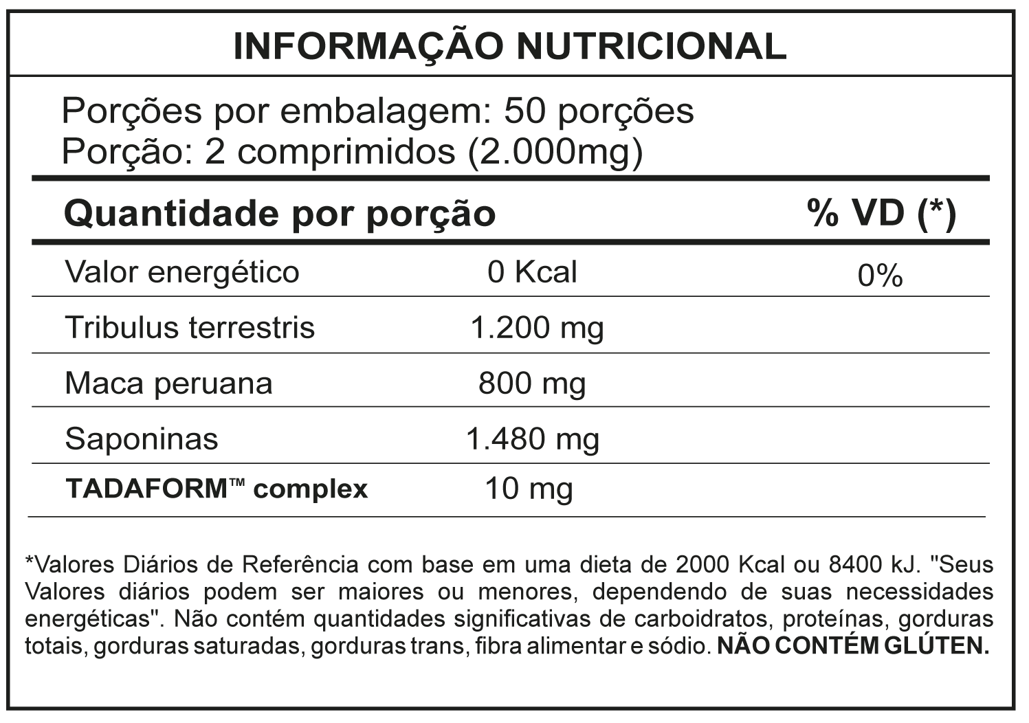 O Tribulus com 90% de saponinas garante alta concentração e pureza do extrato, enquanto a Maca Peruana complementa a fórmula trazendo suporte à energia física e mental.